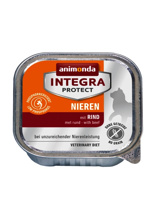 Ova ukusna hrana za mačke, namenjena za upotrebu u slučajevima hronične bubrežne insuficijencije, ne sadrži žitarice. Mačke sa hroničnom bubrežnom insuficijencijom često jedu samo malu količinu hrane ili ništa. Međutim, INTEGRA PROTECT Renal sa govedinom dobro prihvataju mačke sa bubrežnim oboljenjima.