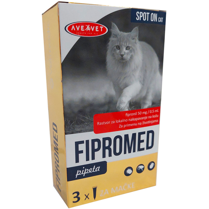 Opis: Rastvor za lokalno nakapavanje Fipromed se koristi kod pasa i mačaka kao tretman i prevencija infestacije ektoparazitima – buvama (Ctenocephalides spp.), krpeljima (Rhipicephalus sanguineus, Ixodes ricinus, Dermacentor reticulatus) i pavašima (Trichodectes canis).