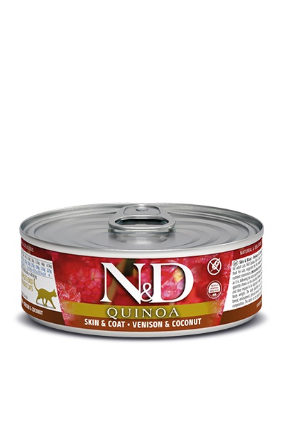 N&D Quinoa Cat Skin & Coat Venison & Coconut ( konzerva 12×80 g ) je kompletna dijetetska hrana za odrasle mačke, preporučena za smanjenje alergijskih reakcija na neki od sastojaka iz hrane i kod nutritivne intolerancije.