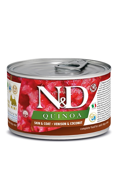 N&D Quinoa Skin & Coat Venison & Coconut je kompletna dijetetska hrana za pse, preporučena za smanjenje alergijskih reakcija na neki od sastojaka iz hrane i kod nutritivne intolerancije. Kompletna vlažna hrana za odrasle pse u konzervi – 140 g.