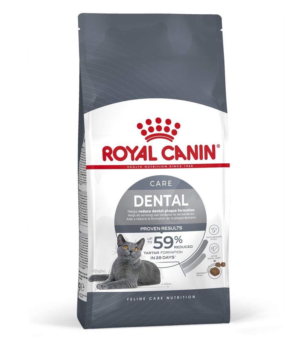 Feline Care Nutrition Dental Care je balansirana formula namenjena odraslim mačkama koje imaju osetljive zube i desni. Zubni kamenac nastaje taloženjem mineralnih soli (koje potiču iz pljuvačke) u dentalni plak. Zahvaljujući specijalno prilagođenoj teksturi i obliku granule osigurano je čišćenje zuba čime se suzbija nastajanje zubnog kamenca. Natrijum polifosforati vezuju kalcijum iz pljuvačke i vrše prevenciju stvaranja zubnog plaka i sprečavaju formiranje zubnog kamenca. Bakterije koje se stvaraju prouzrokuju upalu zuba i desni, loš zadah, i ispadanje zuba.