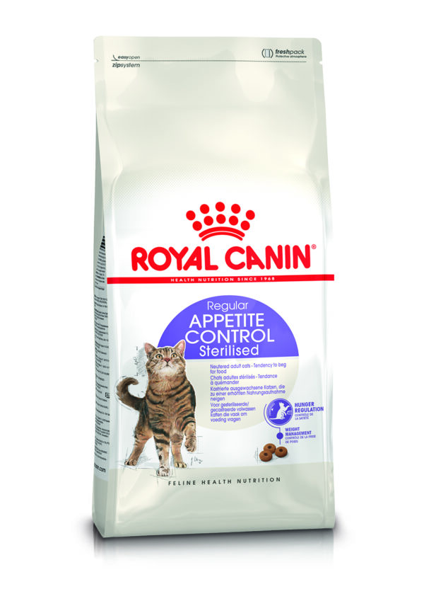 Feline Health Nutrition Sterilised Appetite Control je balansirana formula namenjena odraslim sterilisanim mačkama koje imaju običaj da prose za hranu. Nakon sterilizacije mačka konzumira oko 20% više hrane dnevno, a energetske potrebe se smanjuju za 30%. Kontrolisano unošenje kalorija obezbeđuje manji sadržaj masti i manje ugljenih hidrata. Dodatak L-karnitina mobiliše masne rezerve. Doprinosi zdravom urinarnom sistemu zahvaljujući kontrolisanoj kiselosti mokraće (pH 6-6,5). Visok sadržaj proteina povećava i održava mišićnu masu. Nakon sterilizacije pojedinim mačkama je teško utoliti glad, te Sterilised Appetite Control udovoljava i njihovim prohtevima sadržavajući visok procenat specifičnih vlakana i time sprečava prošenje za hranu i kao i smanjenje osećaja gladi.