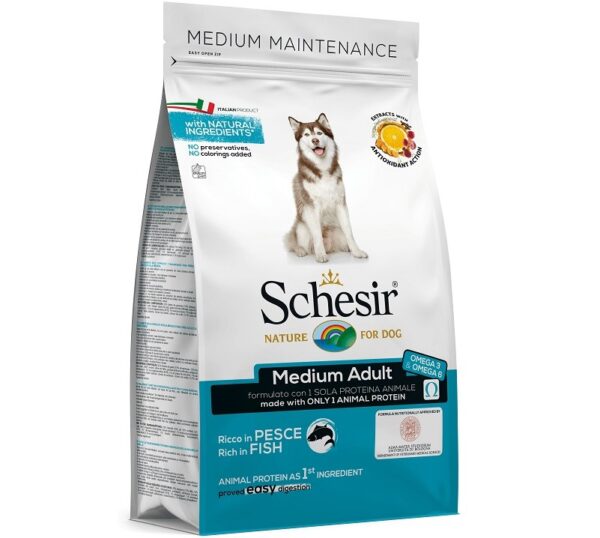Schesir Dry Dog Medium Adult Fish osnova hrane je meso riba, a neke od karakteristika i sastojaka su sledeće: