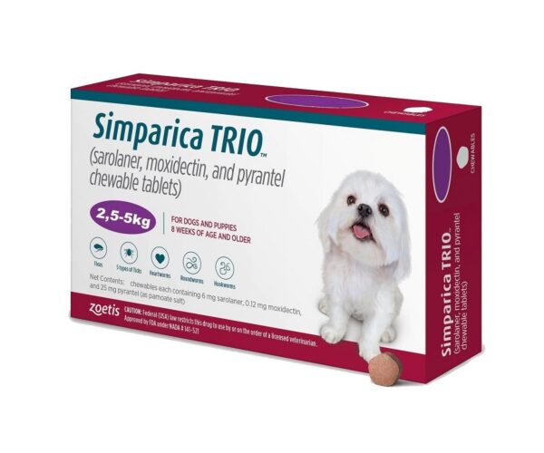 Simparica Trio tablete za žvakanje koriste se za pse koji imaju mešovite infekcije ili su pod rizikom od mešovitih infekcija endo- i ektoparazitima. Ovaj lek se primenjuje iskjučivo kada je istovremeno indikovano lečenje infestacija krpeljima ili buvama i infekcija gastrointestinalnim nematodama. Lek je istovremeno efikasan u prevenciji bolesti srčanog crva i angiostrongiloze kod pasa.