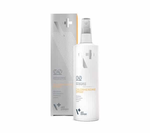 Sprej za negu oštećene kože pasa i mačaka, bakterijske etiologije. CHLORHEXIDINE je idealan za upotrebu na zaraženim ranama i koži sa problemima različite etiologije. Ima snažno antibakterijsko, antiseptičko, antiinflamatorno i hidrirajuće delovanje. Smanjuje upalne procese, ublažava svrab i ubrzava regeneraciju epiderma i proces oporavka kože. Nanosrebro ima jaka antibakterijska i antiseptične osobine, podstiče regeneraciju tkiva i ubrzava zarastanje rana. Dodatkom hlorheksidina,koji ima snažnu baktericidnu i bakteriostatske osobine, preparat je idealan za upotrebu na zaraženim ranama i koži sa problemima različite etiologije. Lanolin i pantenol vlaže i smiriju iritaciju. Ekstrakt kamilice ima umirujuće i antiinflamatorno dejstvo koje pomažu kod opekotina i u eliminaciji svraba.